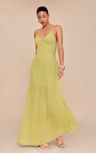 Set the mood for evening with this captivating olive hue. Designed for impact, the olive woven pleated hem detail spaghetti maxi dress flows with a deep V-neckline and delicate spaghetti straps leading into a tailored bodice. The design is finished with a striking pleated hem detail that moves beautifully at the maxi length. Keep styling simple, adding delicate heels and understated jewelry to let the dress speak for itself. This is confident style, effortless done.